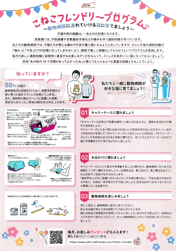 こねこフレンドリープログラム 2024.06.18 JSFM主催 病院が大好きなネコちゃんに育てるためのプログラム ❝こねこフレンドリープログラム❞のご案内です ネコちゃんが病院嫌いにならないように、定期的に病院に遊びに来ていただき、キャリーでの移動や動物病院に慣れてもらうプログラムです 対象ネコちゃんは生後2か月~6カ月齢の子ネコちゃんです 参加ご希望のネコちゃんは予約時または来院時にお申し付けください 数に限りがありますが豪華プレゼントをご用意しております お知らせ一覧へもどる