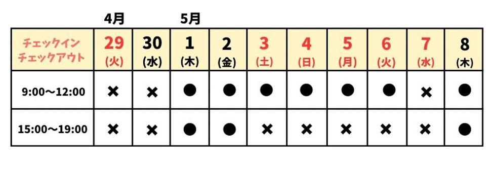 ※4/29~4/30はスタッフ不在のためホテルのご利用は出来ません