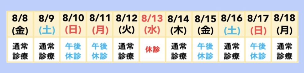 お盆期間の診療のご案内 2025.07.08 お盆期間中は右図日程で診療いたします お間違えのないようご注意ください インターネット予約が満員になっている場合でも 緊急の方はお電話にてご相談ください お知らせ一覧へもどる