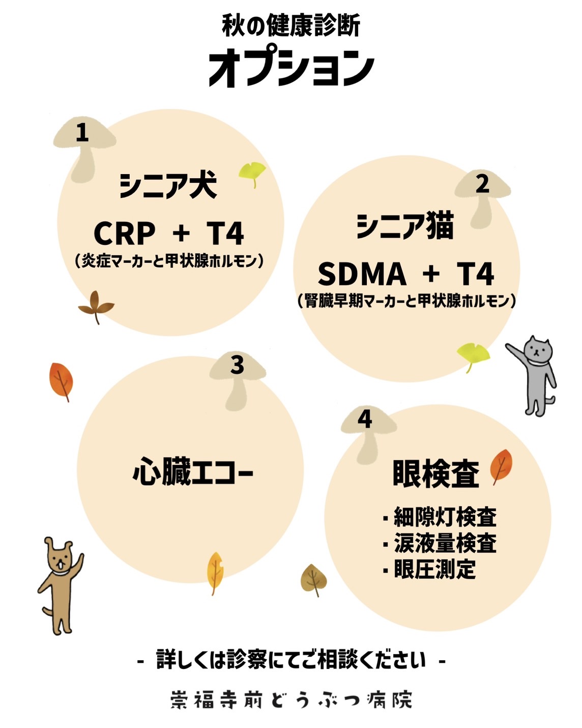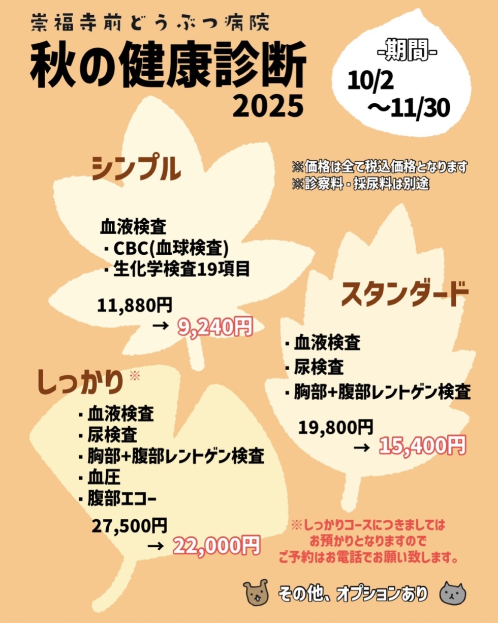 秋の健康診断キャンペーン 2025.10.02 10月2日~11月30日の期間中、健康診断のお得なキャンペーンを実施いたします ワンちゃん、ネコちゃんは子供に見えても、人間の4倍の速さで年をとります 1歳を過ぎたら年に1回、7歳頃からは年に2回の定期的な健康診断を推奨しています ぜひこの機会にご利用ください ※血液検査は外の検査会社で行いますので、結果の報告は後日となります ※しっかりコースはお預かり検査となりますので、お電話のみのご予約となります お知らせ一覧へもどる